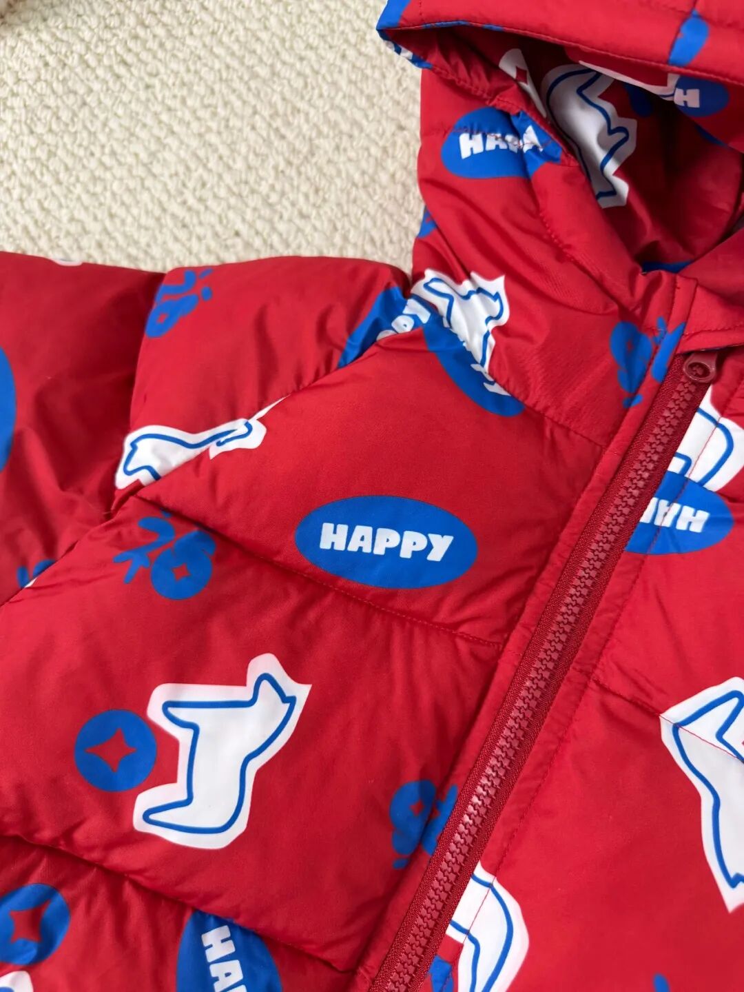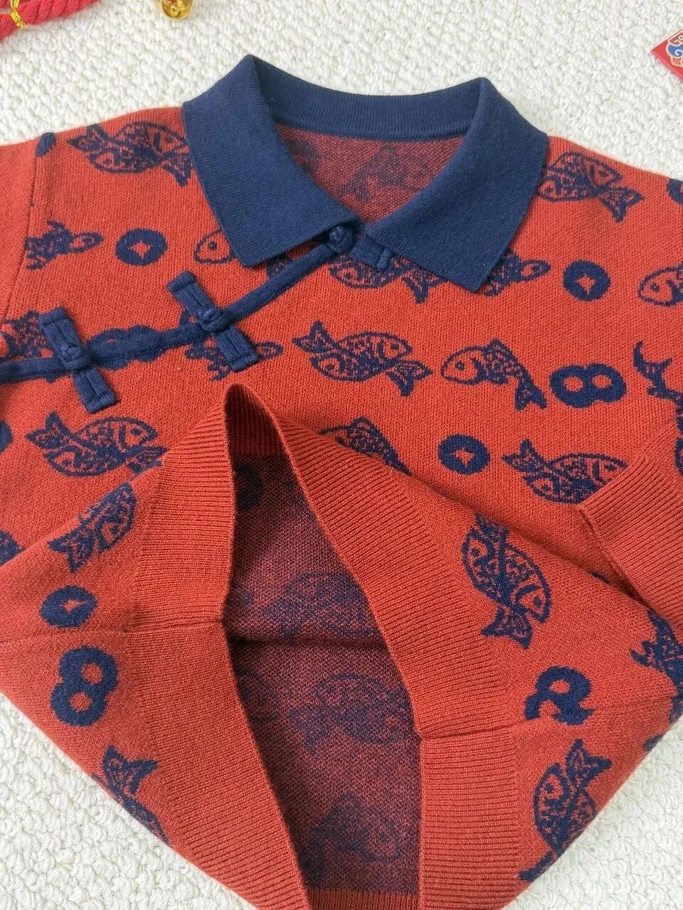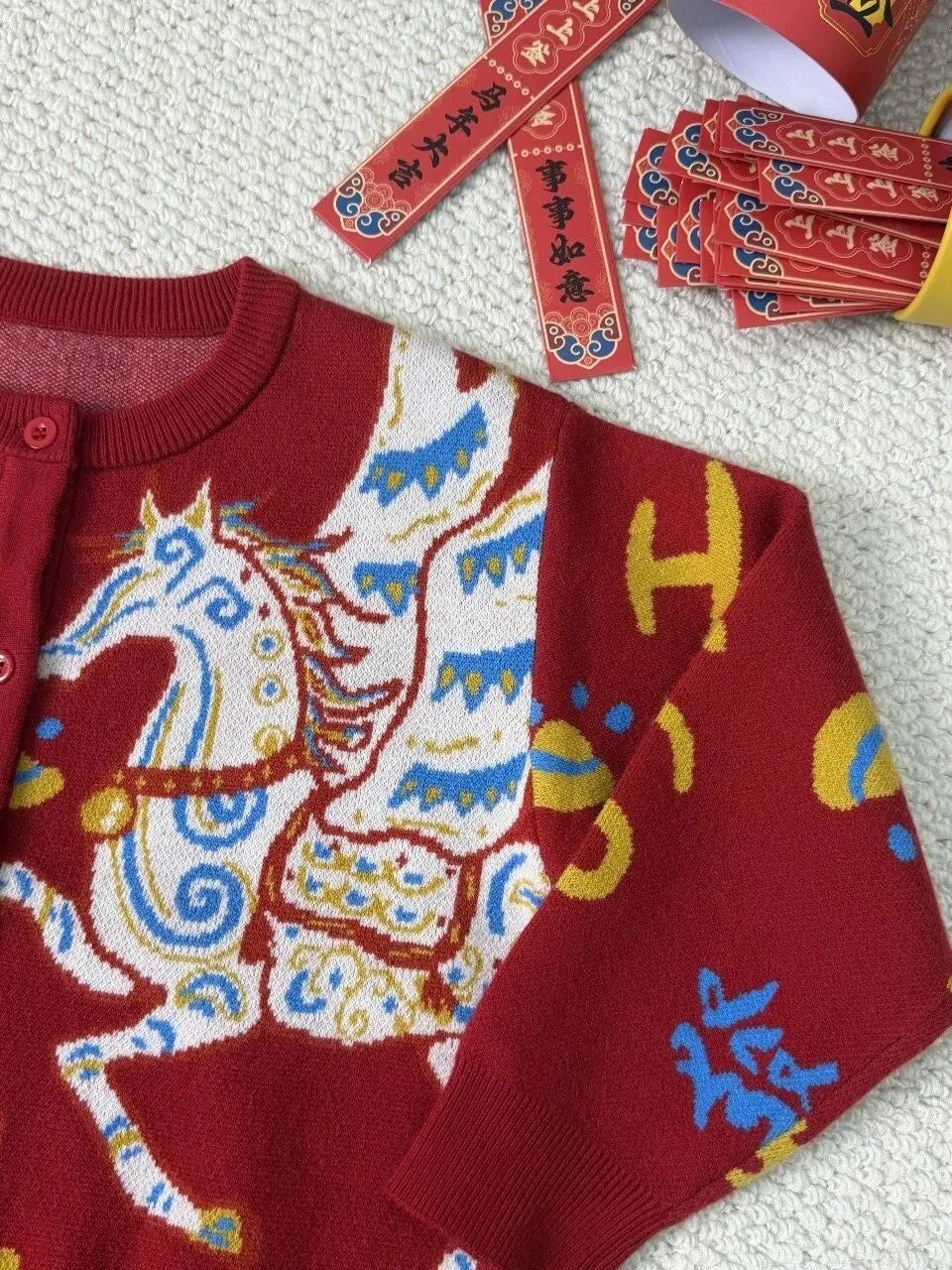 白红相间的底色,整件衣服上都是福马彩印,新年氛围感满满,穿出去也不容易撞衫。