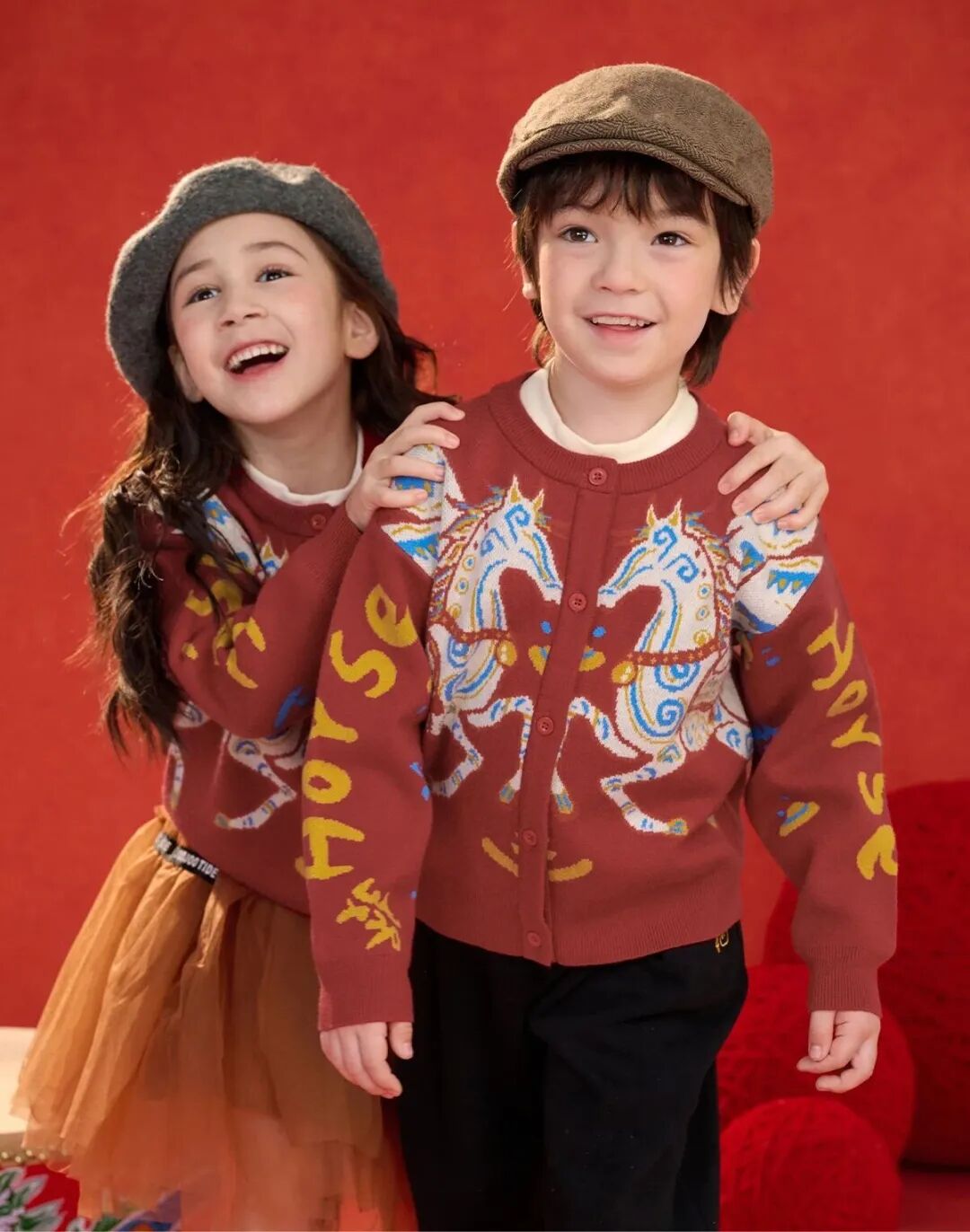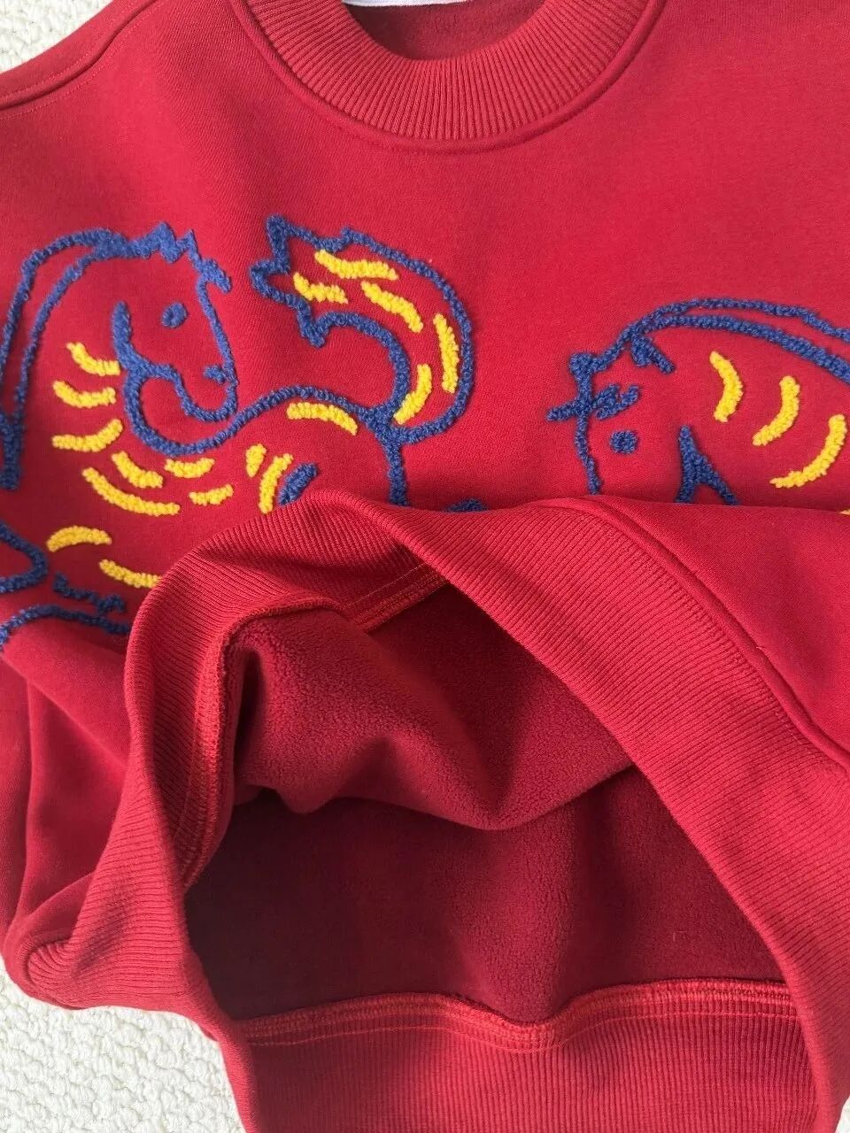 新年红底色搭配奔腾骏马的毛巾绣印花,整件衣服重工又特别,男孩女孩都能穿。