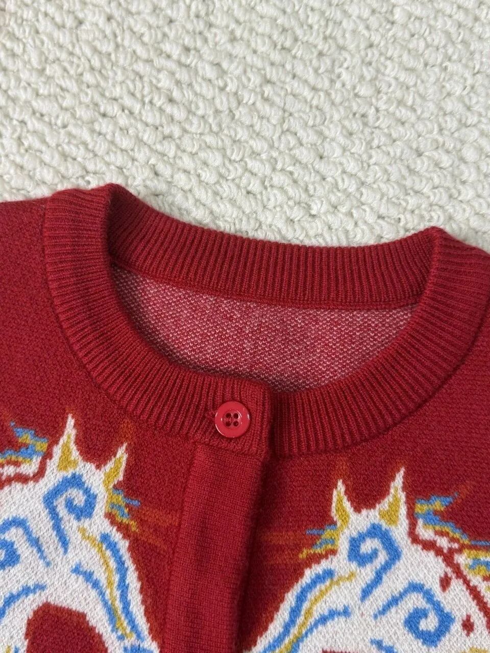 新年红底色搭配上胸前栩栩如生的蓝色福马刺绣,整件衣服就像一幅精致的年画一样。
