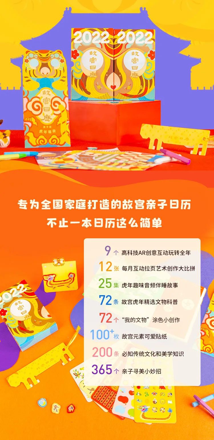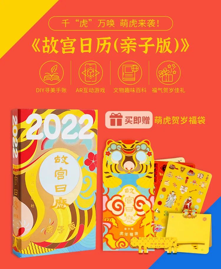 它超级划算、超级惊喜!故宫亲子历附赠萌虎福袋,包含萌虎文物书签尺、多功能相框祈福卡和100+枚故宫元素童趣贴纸,相信无论是大人还是孩子都会爱不释手一整年!