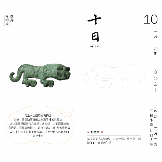 它该怎么玩呢?在第一天“文物美”环节,孩子将看到日历中威武吉祥的虎文物做“自我介绍”,用眼观察文物的细节,了解文物背后的历史与文化;第二天“创造美”,孩子可以放飞想象力,释放创造力,玩个涂色小游戏,对文物进行“再创作”!