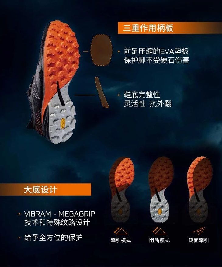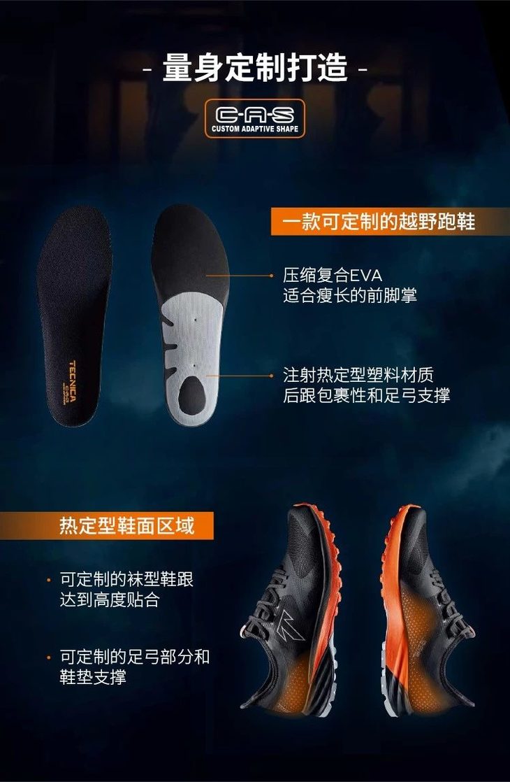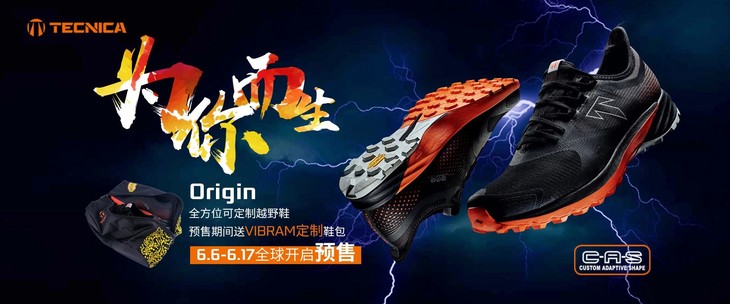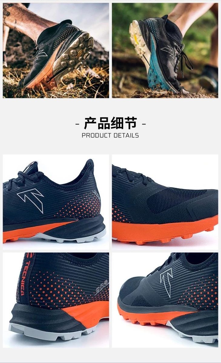 ORIGIN越野跑鞋一改以往TECNICA鞋子亮配色,改为尊贵黑搭配一抹橙色,整体简洁漂亮,低调中透着科技感,更好搭配越野服装。