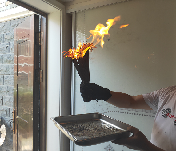 农历5月4日晚上子时及5月5日午时,点燃光明灯(内放净精油、富贵精油、纳财精油),并用道元香108根,洒净房间后插在米筒上。