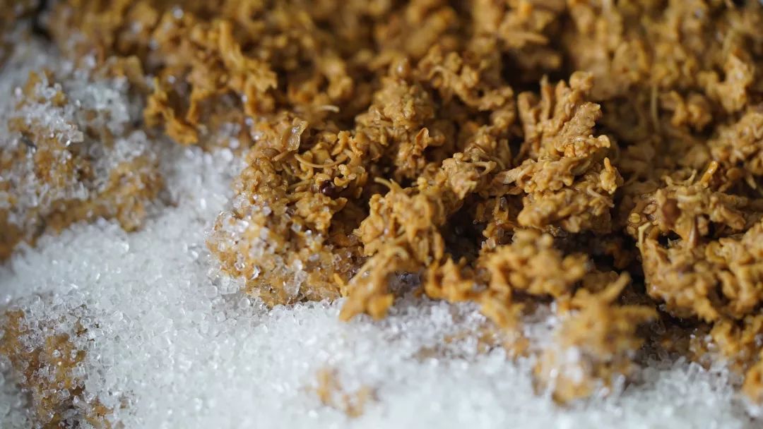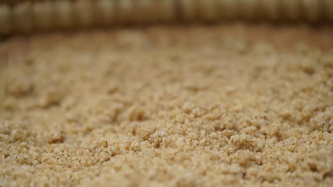 白砂糖拌入腌渍后的桂花,颜色变成金黄色,粒粒金黄的砂糖和被揉捻过的桂花紧密混合,全靠做糖人的手法进行均匀混合后用生石灰土法进行干燥,这种干燥方法的力度极为霸道,所以在混合拌糖的时候没有及时散开的部分,会有小小的结块,此时倒显得极为有趣,像是在砂糖里藏着的小冰糖,糖粒中的小糖块,刚好空口吃下,更满足。