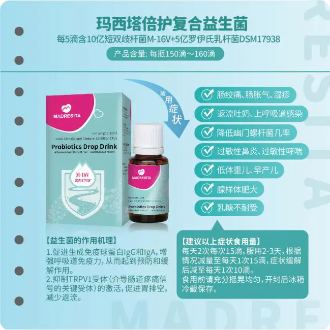 玛西塔倍护益生菌:倍护复合益生菌是罗伊氏乳杆菌和m16v双菌的组合,主要作用机理是:促进生成免疫球蛋白lgG和1gA,增强呼吸道免疫力,从而起到预防和缓解作用。同时抑制TRPV1受体(介导肠道疼痛信号的关键受体)的激活,促进胃排空,减少返流。