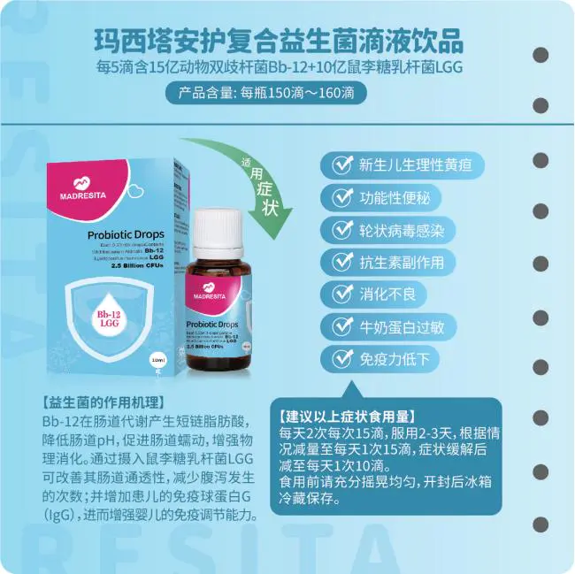 主要适用于:(1)新生儿生理性黄疸 (2)功能性便秘 (3)轮状病毒感染 (4)抗生素副作用 (5)消化不良 (6)牛奶蛋白过敏 (7)免疫力低下.。建议以上症状食用量:奶后半小时使用,每天2次每次15滴,服用2-3天,根据情况减量至每天1次15滴,症状缓解后减至每天1次10滴。 食用前请充分摇晃均匀,开封后冰箱冷藏保存。