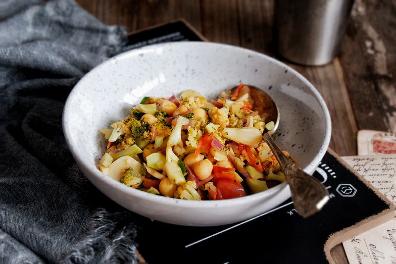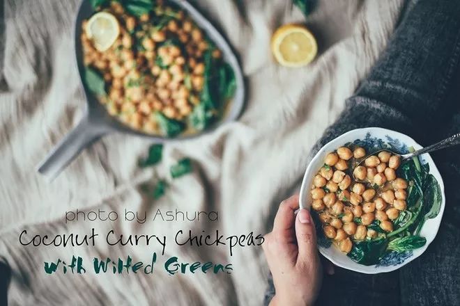 加入鹰嘴豆翻炒片刻,加水没过豆子、加椰浆、咖喱粉、黑胡椒粉和盐炖煮10分钟;