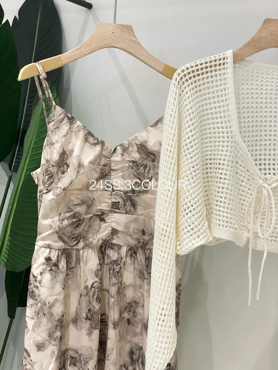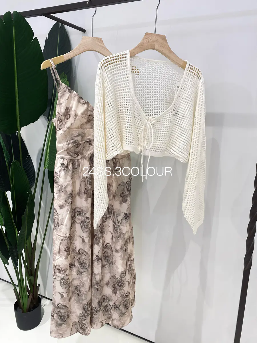 吊带连衣裙可以搭配防晒针织衫,或者镂空罩衫穿着,会更添温柔感;