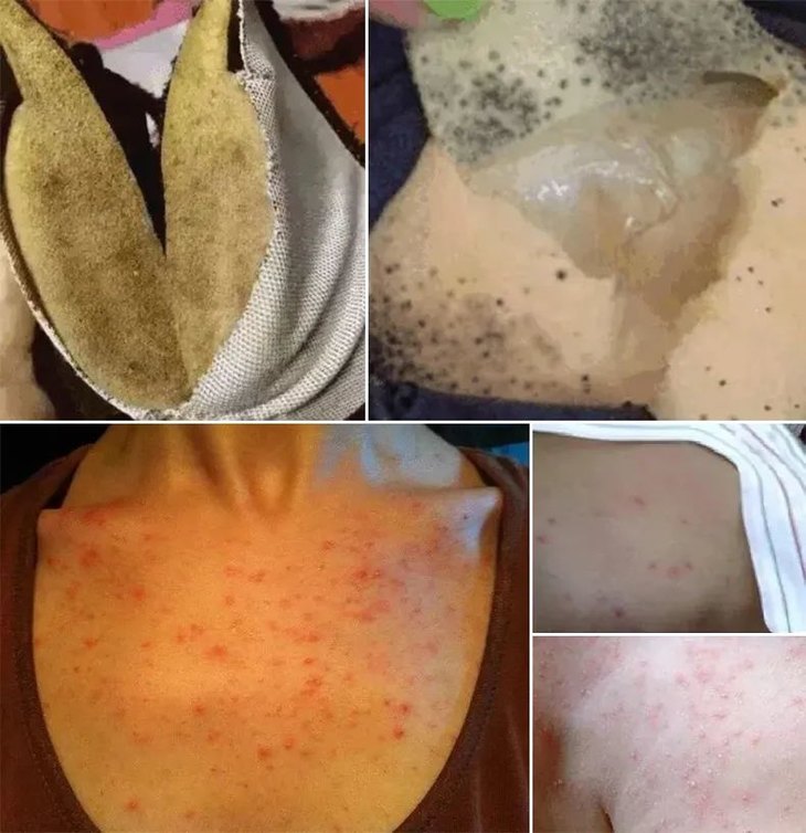 吸附汗水后不透气难干,容易滋生细菌,导致内里发霉,长出大片红疹: