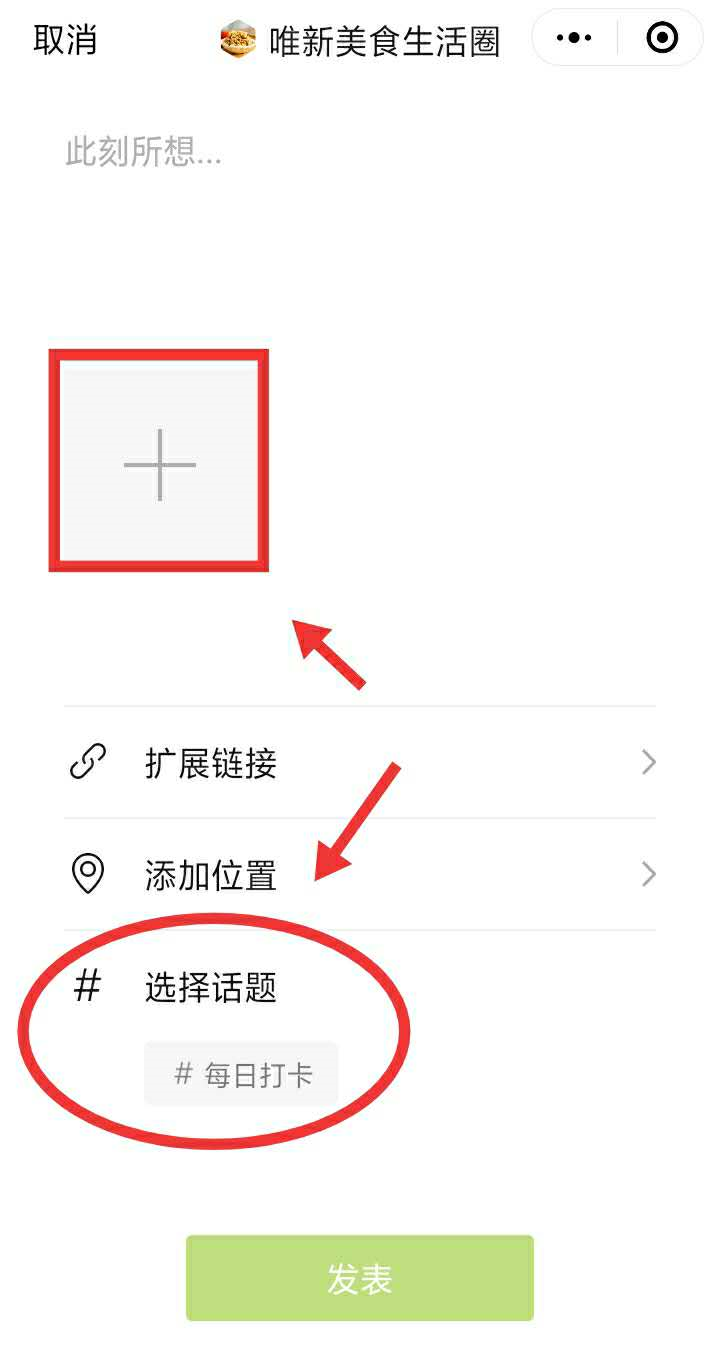点击灰色标识【+】,添加视频或图片,还可以选择话题,圈友们一起讨论