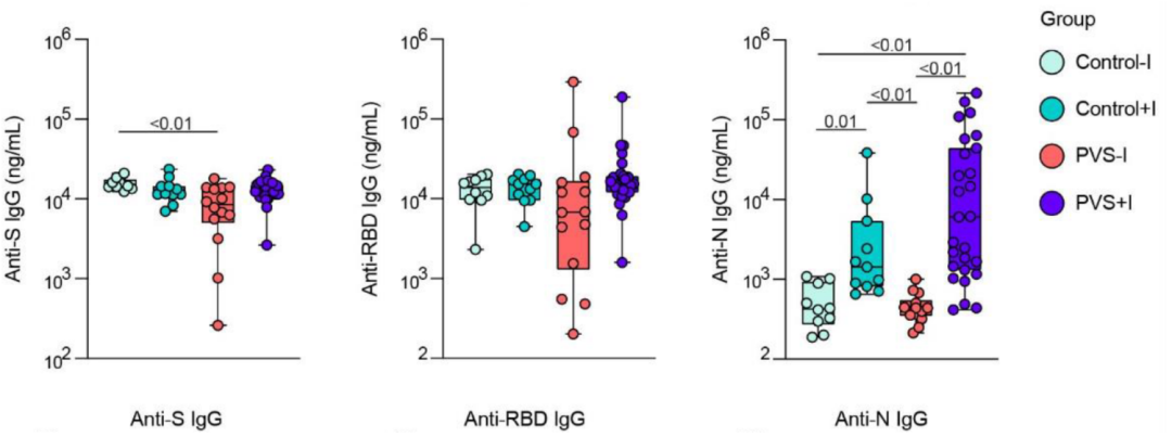 情况是这样的:研究人员找了42个PVS(疫苗后遗症)患者,以及22个打过新冠疫苗但健康的对照组。其中又把PVS和健康对照组分成感染过新冠、未感染过新冠两个亚组,所以一共是四个亚组:PVS+I (感染过新冠的疫苗后遗症患者)、PVS-I(未感染过新冠的疫苗后遗症患者)、Control+I(感染过新冠的健康对照)、Control-I(未感染过新冠的健康对照) 。然后对对比这四组人员的血清标志物,试图发现他们的差异。