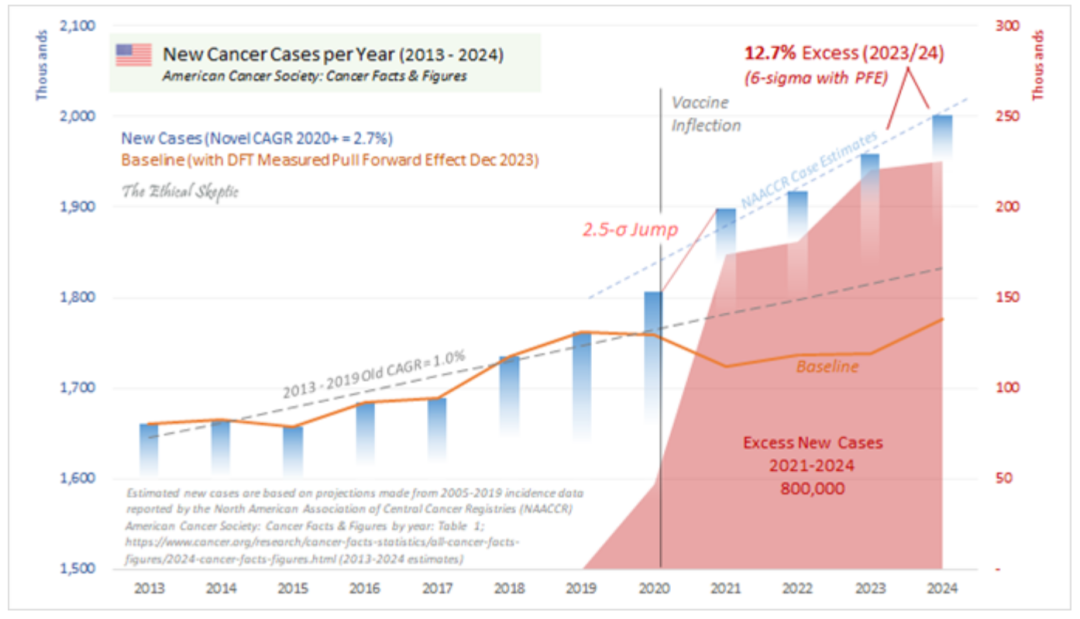 美国新发癌症病例数曲线。蓝柱为实际数,橙色线为理论值,红色块为超额发病数,可见2024年超额发病数已经达到达到25万例,占当年癌症发病总数的12.7%。并且趋势有增无减。数据由美国癌症协会提供。