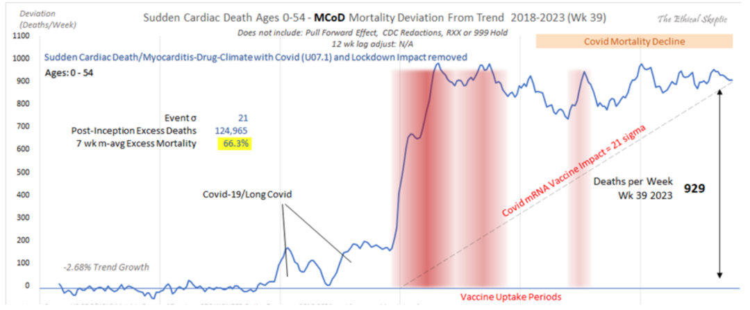 美国0-54岁心源性猝死案例每周统计数据。三个红色竖条分别是mRNA疫苗第一针、第二针、第三针时间段。即使针后很长时间,病例数依然保持高企