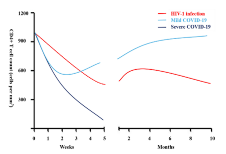 并非只有打疫苗后会造成CD4+ T细胞降低。感染新冠之后同样也会导致3-6个月内CD4+ T细胞的下降。严重感染会下降更多。图为艾滋病感染(红线)、轻微Covid-19感染(蓝线)、严重Covid-19感染(黑线)下人体CD4+ T 细胞浓度随时间推移的变化【4】