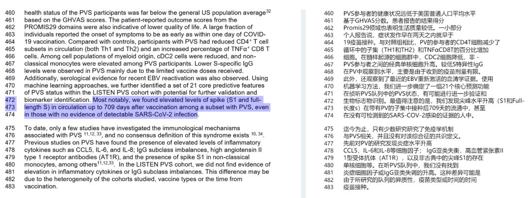 论文的原文表达是: "值得注意的是,我们发现PVS(疫苗后综合症)人群中,在疫苗注射之后709天仍然观察到了刺突蛋白(包括S1和全长S蛋白)循环水平的升高,即使该人没有感染Sars-Cov-2的证据。" 实际上不仅是PVS人群检测出刺突蛋白,打过疫苗的健康人群刺突蛋白也升高了。请往下看