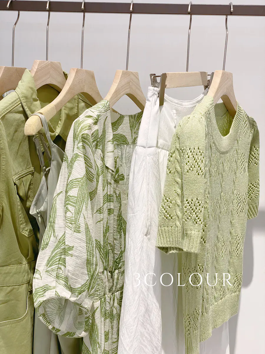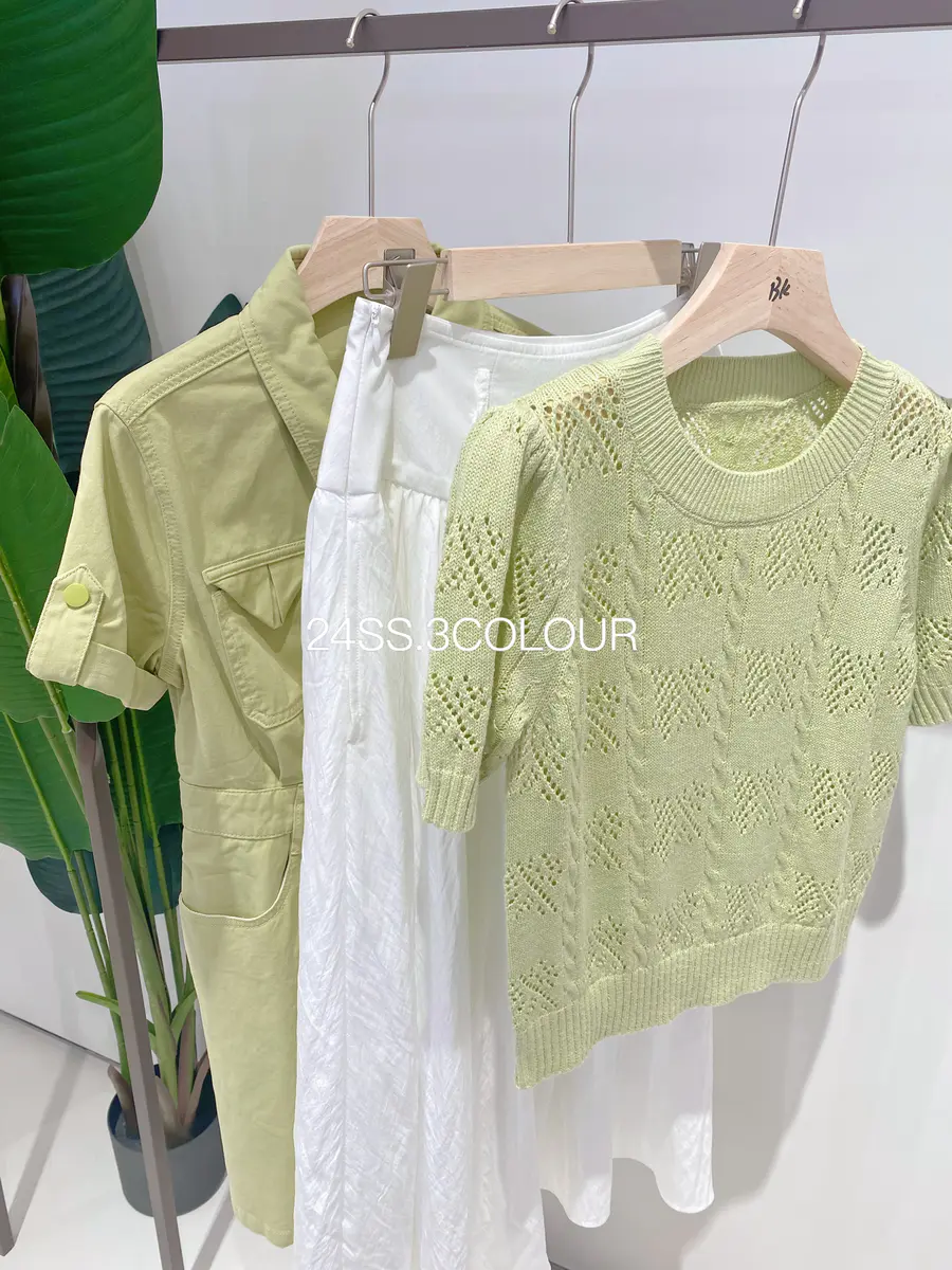 绿色与白色的碰撞,给人眼前一亮的感觉,镂空T恤+小白裙,是纯净是美好;