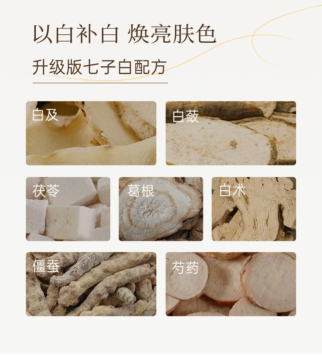 更厉害的是我们还搭配了中草相互配合,借鉴了宫廷秘方七子白的配方思想,在此配方基础上做了升级,有白及、白蔹、茯苓、葛根、白术、僵蚕、芍药,7 种白色中草,帮你开启磨皮白白滤镜,其中的亮点就是加入了葛根,大家洗澡的时候可以这样交叉揉搓,濡养肌肉,肌肉紧致了就会看起来更纤细紧致。