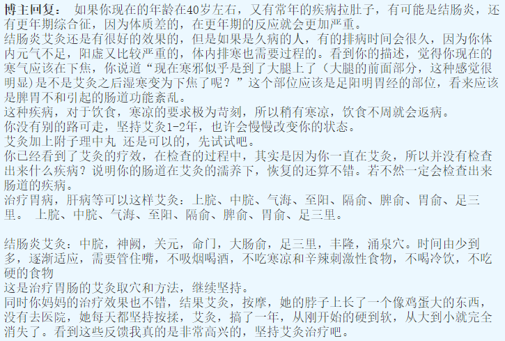 结肠炎艾灸还是有很好的效果的,但是如果是久病的人,有的排病时间会很久,因为你体内元气不足,阳虚又比较严重的,体内排寒也需要过程的。看到你的描述,觉得你现在的寒气应该在下焦,你说道“现在寒邪似乎是到了大腿上了(大腿的前面部分,这种感觉很明显)是不是艾灸之后湿寒变为下焦了呢?”这个部位应该是足阳明胃经的部位,看来应该是脾胃不和引起的肠道功能紊乱。