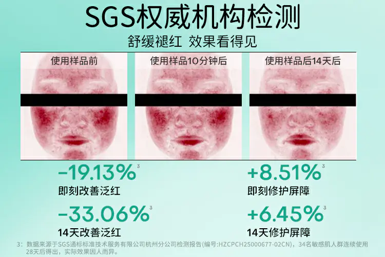 a.SGS实测泛红急救湿敷,即刻退红-19.13%,敏感反应降低7.04%