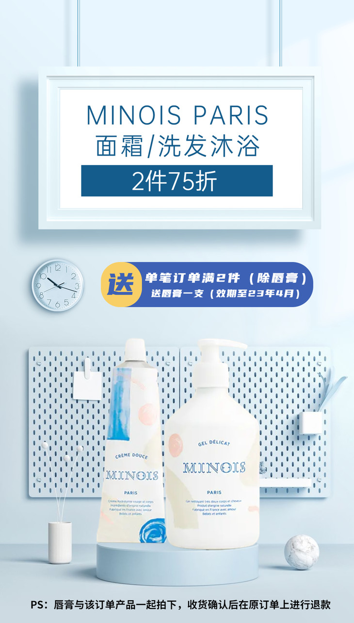 MINOIS PARIS系列,源自法国,天然伴随宝宝“橙”长。新生儿起就可用。很多妈妈像发现宝藏一样的好物,倾情推荐~同事还有超级福利活动,单笔订单满2件(除唇膏),送唇膏一支(效期至23年4月)唇膏与该订单产品一起拍下,收货确认后在原订单上进行退款。