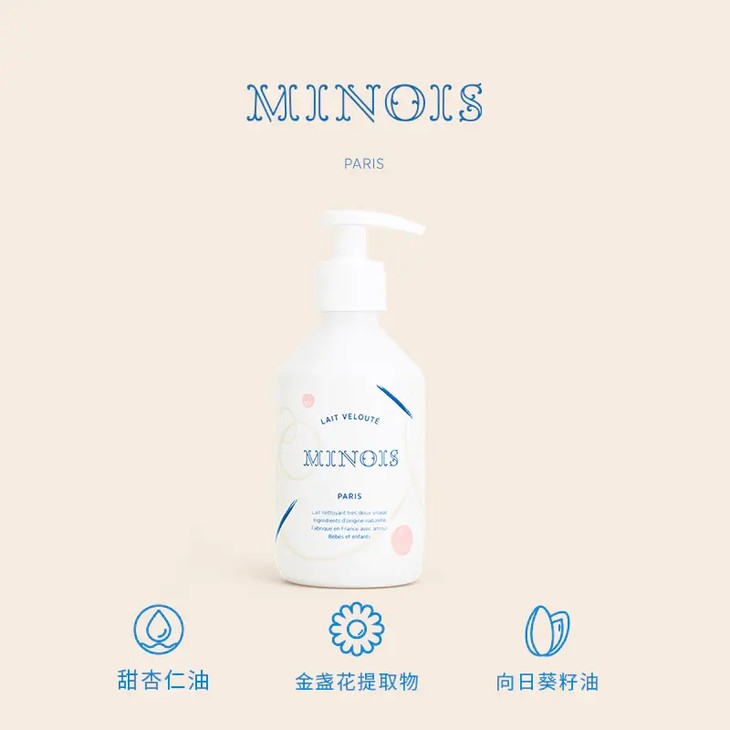 Minois主要在法国高端药妆店和有机商品专营店设有柜台,专为婴幼儿娇嫩皮肤设计,不含对羟基苯甲酸酯,不含硫酸盐,不含苯氧乙醇,不含硅酮,不含色素,100%法国制造,从宝宝出生就可以开始使用。