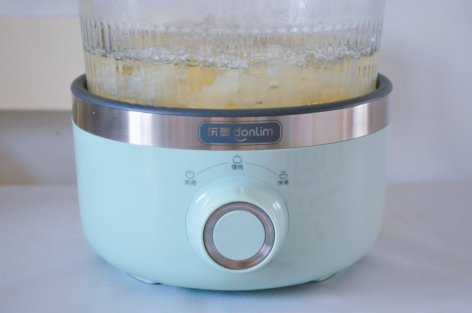 3.把银耳倒入东菱养生锅,水倒至慢炖的最高水位,先开快煮功能把水煮开。