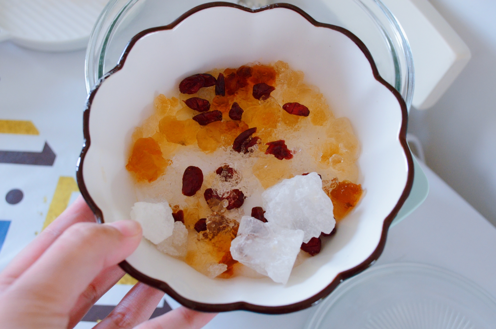 6.最后倒入桃胶、蔓越莓和冰糖,继续慢炖半小时。