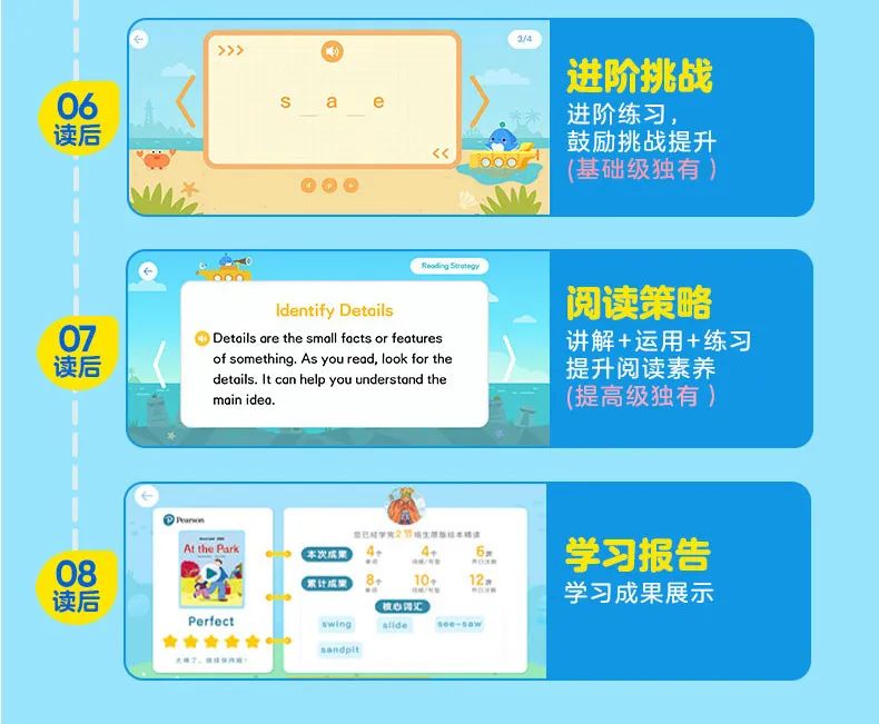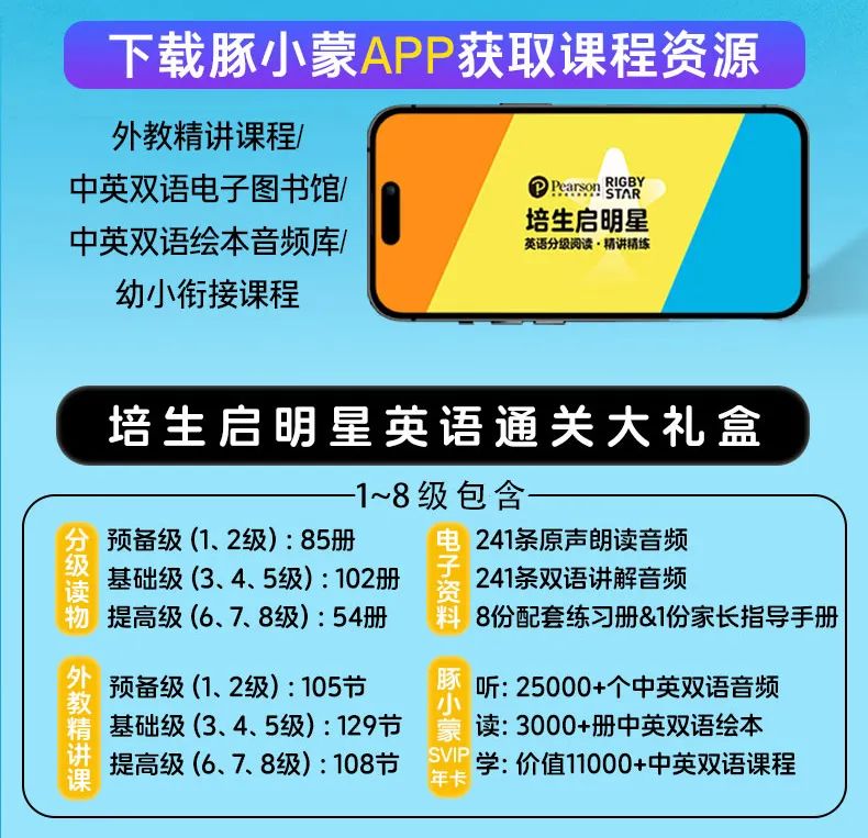 通过上面的介绍,相信家长们已经理解到,培生课程+豚小蒙APP远不止助力阅读启蒙这么简单,更是提供了一个系统英语学习方案: