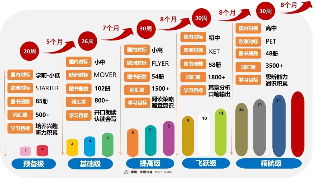 不仅在原有的3个级别上(预备级-基础级-提高级)增加了飞跃级和领航级两个级别(预计26年上市),分别对应初中和高中的需要的英语能力训练。