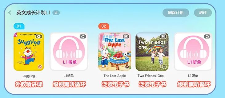 测评有了结果后,可以开启课程,也可以选择【制定英文成长计划】,开启系统学习——当前绘本用来精读,听单用来熏听,其他绘本则用来泛读。