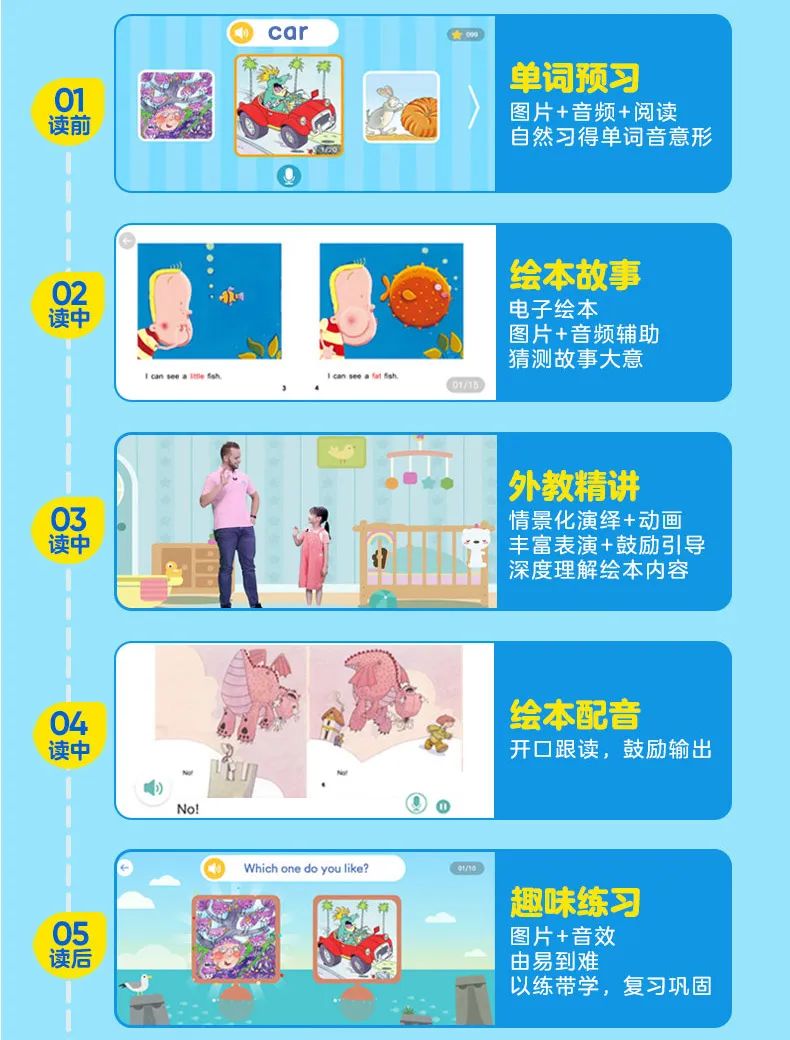 单词预习(5 分钟)→绘本故事(3 分钟)→外教精讲(8 分钟)→绘本配音(3-5分钟)→趣味练习(3 分钟)