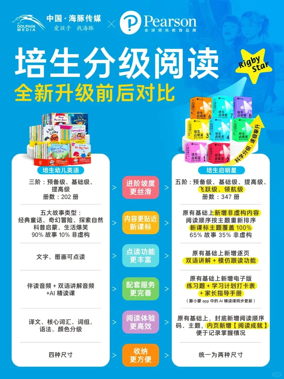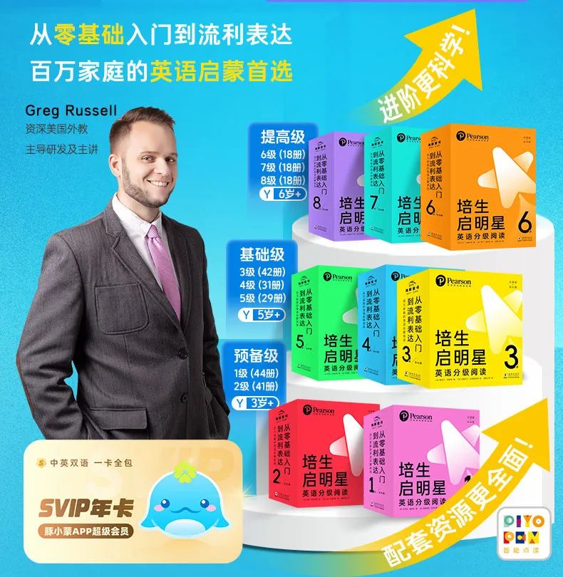 从包装设计到内容编排,再到保姆级丰富配套资源,经过两年多时间反复打磨,旨在让所有中国家庭在家就能轻松无痛做英语启蒙,并助力孩子从零基础稳步进阶到自主阅读和流利表达,培生启明星,真的闭眼入就对了!