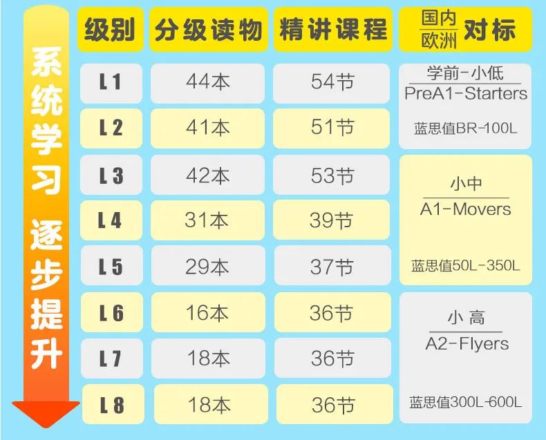 每个级别也都增加了册数,降低孩子进阶的坡度和难度(每级跨度仅5%~8%,语言难度层层递进无压力)。