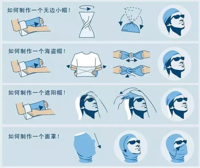 ④ 求救信号:亮色头巾挂高处或挥摆,方便搜救定位。