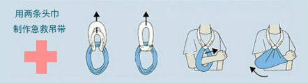 ② 手臂吊带:骨折、脱臼时,做成悬挂吊带,固定伤肢防二次伤害;