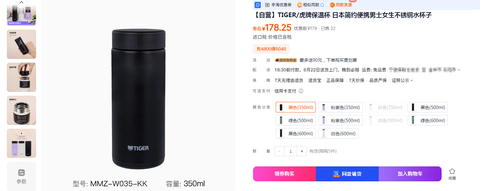 虎pai新款!304不锈钢随身直饮保温杯(350ml)