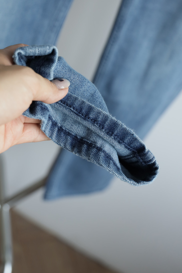 大裤口直筒宽松版型,浅蓝色水洗,自然落色,少许磨破+做旧效果