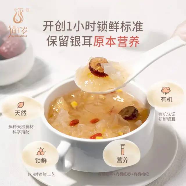 这款猫千岁取材于燕窝+鲜银耳+红枣+枸杞,最后才得出这杯高颜值的即食饮品。