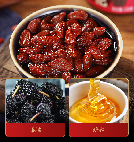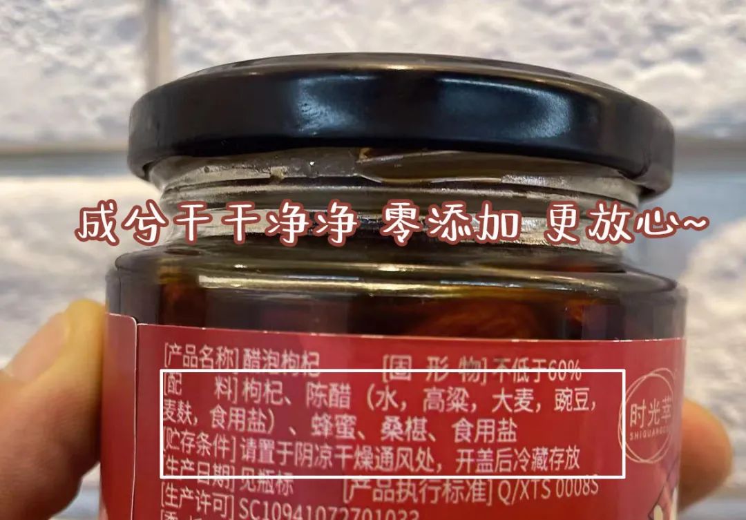 为了调和口感,这款醋泡枸杞在泡制时,还添加了蜂蜜、甘草、金银花、桑葚等秘制配方进行调制,提升口感,也提高滋补功效。