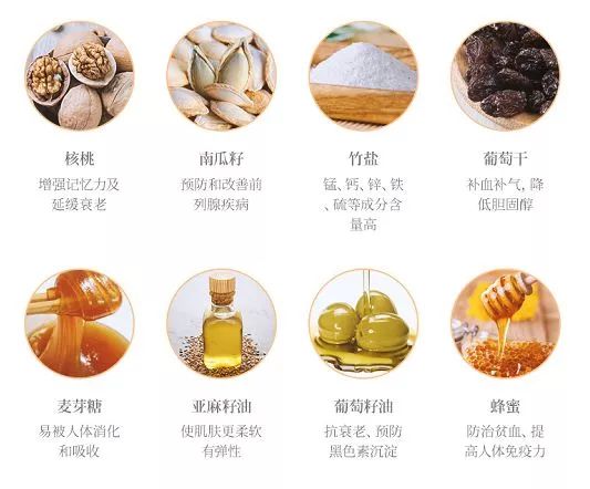 在“五黑”的基础上加入“八珍”:南瓜籽、核桃仁、核桃、葡萄干、竹盐、亚麻籽油、野生蜂蜜、葡萄籽油、麦芽糖。