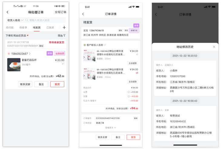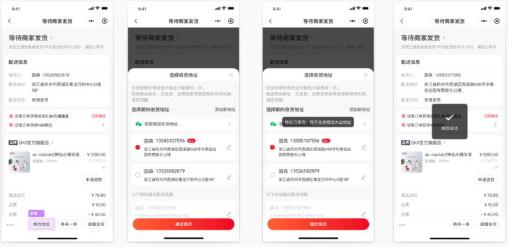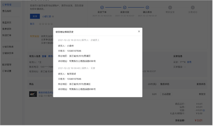 买家修改地址后,买家和商家订单详情、商家导出的订单信息,均按照修改后的收货地址进行展示