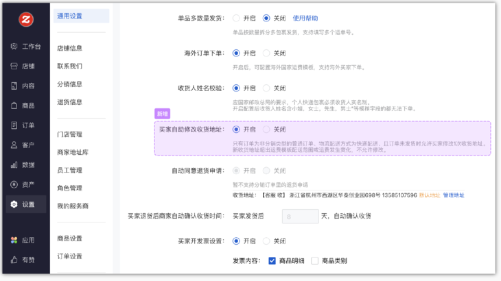 在PC端商家后台「设置-订单设置-买家自助修改收货地址」,商家选择“开启”后(系统默认选择关闭),符合修改条件的买家订单详情即会展示修改地址入口。连锁店铺情况下,仅支持总部统一设置。