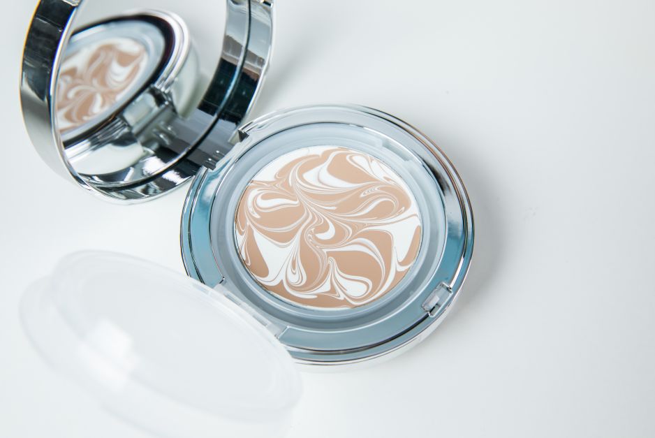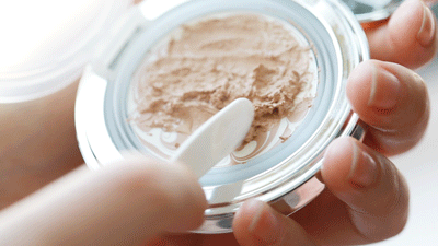 上妆时用粉饼在粉膏上轻轻打圈,膏体会释出精华液水珠,再打圈揉一下,水珠会融合,轻轻在脸上均匀拍打上妆即可。