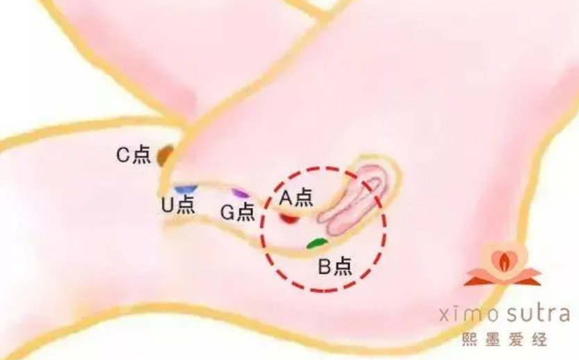 首先C点,就是我们通常说的小豆豆,也就是音蒂,U点就在音道口的位置,G点是音道内3~5cm的地方,AB点是在宫颈口。
