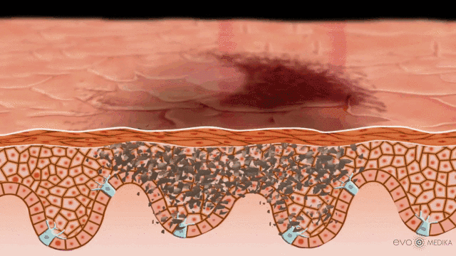 产生原因有先天性因素,也有后天因素,比如说日晒、湿疹、机械摩擦、药物等等。如果你拿手扒开皮肤,它是不会变颜色的。