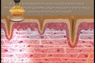 *(为什么不能用在没有骨性区域的地方?射频原理是选择性加热真皮层,让水分子高速震荡而产热,而眼睛的含水量非常高,用在眼睛上容易造成灼伤)。
