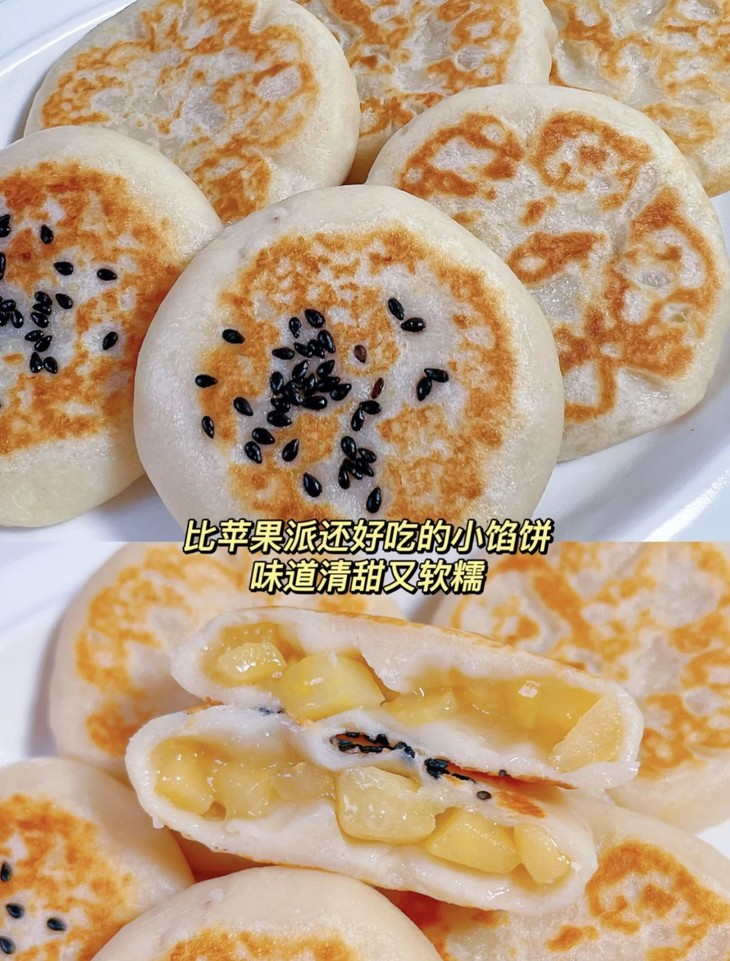 4.面团揉成长条分成六等份,取一份擀成薄片放入适量苹果馅,收口压扁表面撒少许黑芝麻,小火煎至两面金黄即可小月龄宝宝吃,苹果丁可以切碎点,也可以把苹果换成香蕉,都特别好吃,大点宝宝吃山药蒸熟后可以适量加点糖调味宝宝会更喜欢