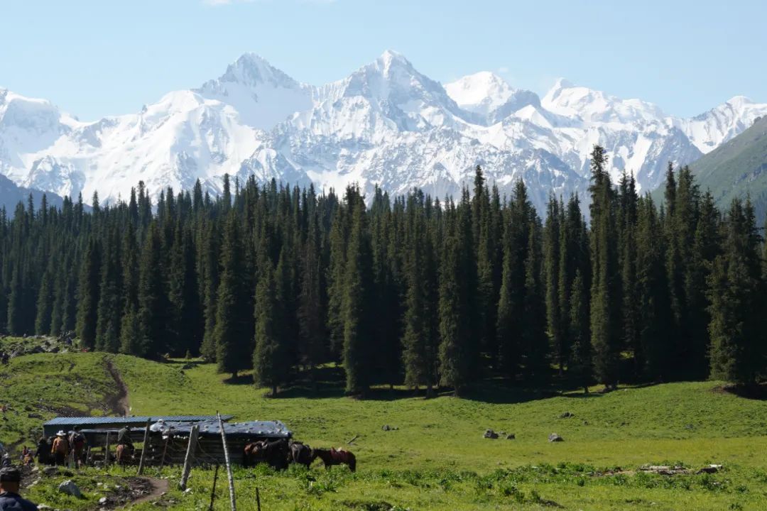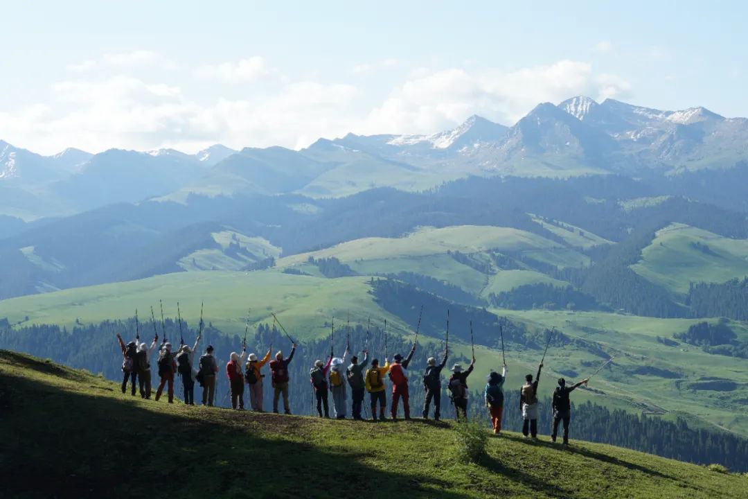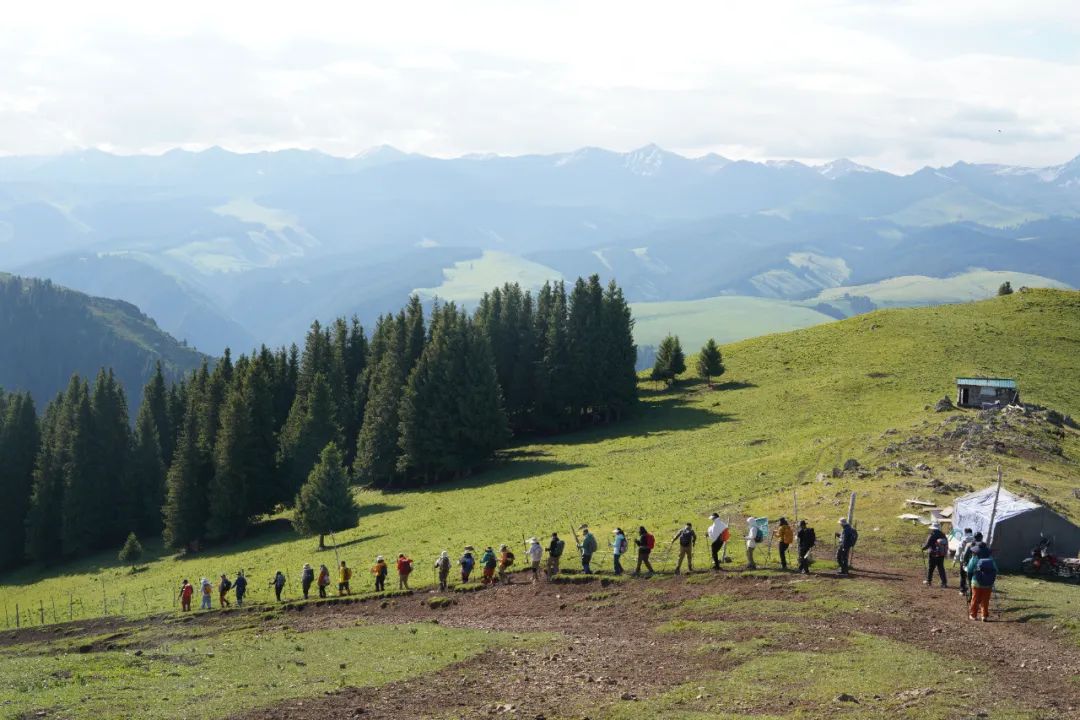 全景喀拉峻也有一个非常有名的打卡点,叫做鲜花台。景区还在下边修了电梯,从排队打卡进阶到了无痛打卡,人依旧是乌央乌央的。但我们没有在这停留而是直奔徒步起点,穿过森林,野花开满草坡,这不比网红点香吗?