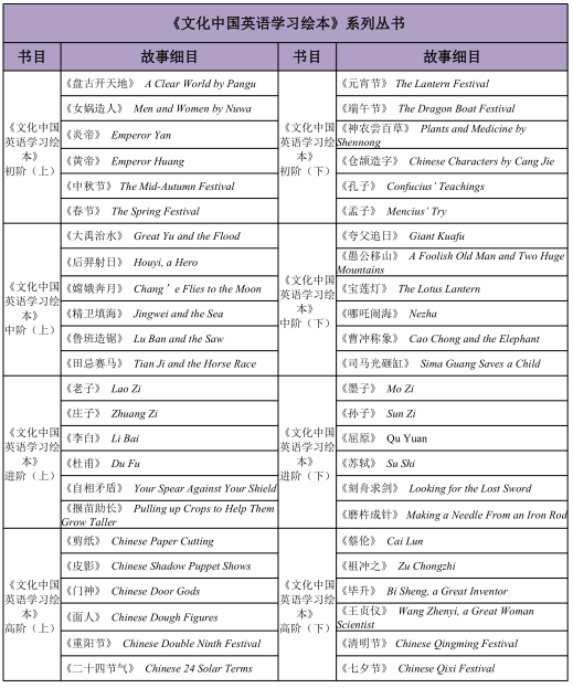 《文化中国英语学习绘本》是一套落实国家教育方针、贯彻“立德树人”“五育并举”要求的英语学习读物。绘本由国内外教育教学专家、教师联袂共创,内容依据《义务教育英语课程标准(2022年版)》一级、二级目标编写,适合小学阶段学生阅读学习,并配备多元数字化教学资源,助力开展智能化英语教学;精选 48 个中华优秀传统故事,采用“跨文化视角”“剧本台词”方式创编,让中华优秀传统文化走进学校课堂,让中国学生学会用英语向世界讲述中国故事。
