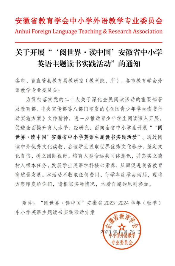 为贯彻落实教育部关于全民终身学习活动的通知精神,进一步推进全民终身学习活动,“‘阅世界·读中国’安徽省中小学英语主题读书实践活动”正式开启。